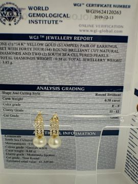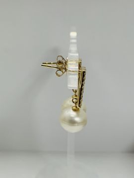 14ct Yellow Gold Pearl and Diamond drop earrings featuring, 2 white South Sea Pearls, with 44 round brilliant cut Diamonds (0.58ct TDW), grain set.
