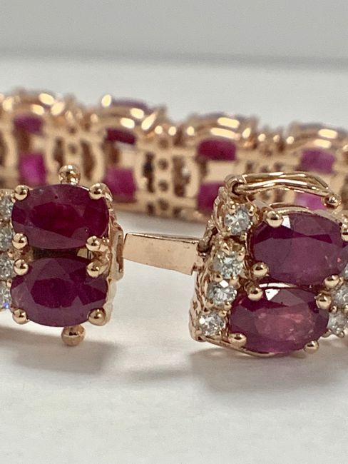 14ct Rose Gold Ruby and Diamond double row bracelet featuring, 44 oval cut, medium to dark red Rubies (21.79ct TSW), claw set, with 88 round brilliant cut Diamonds (1.67ct TDW), claw set.
