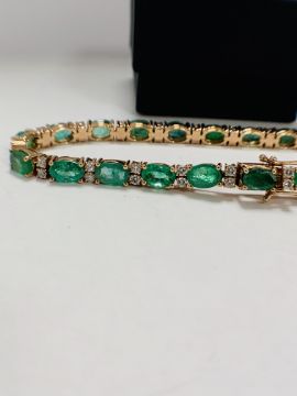 14ct Rose Gold Emerald and Diamond bracelet featuring, 21 oval cut, light green Emeralds (9.03ct TSW), claw set, with 42 round brilliant cut Diamonds (1.02ct TDW), claw set.