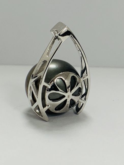 14ct White Gold Pearl and Diamond pendant featuring, round brilliant cut Diamond (0.06ct), grain set, with greyish black Tahitian Pearl.