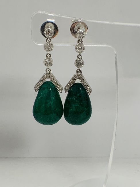 14ct White Emerald and Diamond drop earrings featuring, 2 cabochon tear drop, deep green Emeralds (21.34ct TSW), with 34 round brilliant cut Diamonds (0.33ct TDW), claw set.