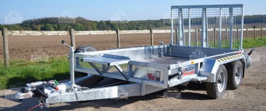 Nugent Trailer P3228H Gross weight: 3500 kg. Loading height 403 mm. Ramp with intergrated propstands, ball hitch, twin axle, platform size (L/W): 3.14 m/1.87 m. Lights and brakes, spare wheel, unladen weight 775 kg
