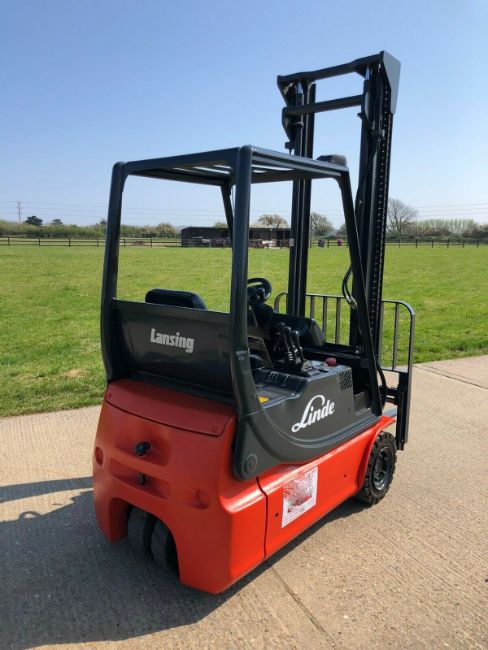 Linde Electric Forklift Truck E14. 3.2 metre mast with side shift. 1.4 tonne lift very compact, in fantastic condition. Safety certificate and serviced. Brilliant battery complete with charger. 3 wheeler