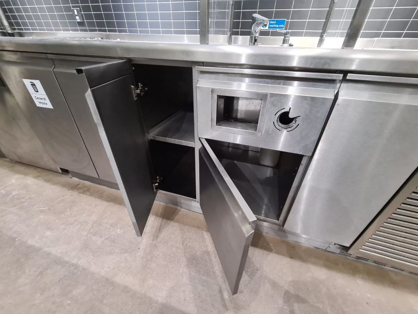 Stainless Steel Counter Unit including 7 storage cupboards, 1 large sink unit, 1 small sink unit with 2 glass balastrades at either side. Approx 11 1/2 ft long, 2.5ft depth, 3ft height