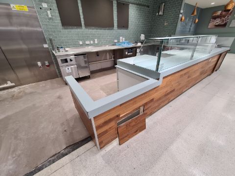Serving Counter with Glass Display Front and Storage. Approx 16. Ft long. L bend 6ft 4.