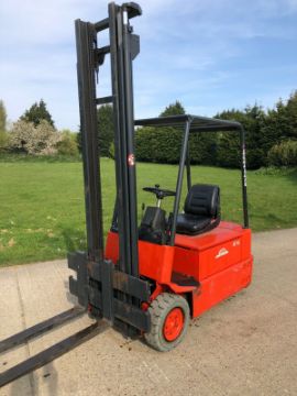 Linde Electric Forklift Truck E15. 4 metre mast. 1.5 tonne lift, very compact. Good condition. Good battery complete with charger. 3 wheeler