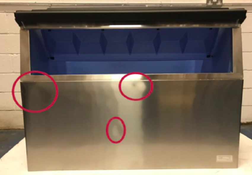 The B-801SA storage bin configures perfectly with Hoshizaki Ice makers to ensure ample quantities of ice at all times. Rear: no issuesRight hand side: no issuesTop & Inside: No issues, ice scoop, pipes and four feet.Front: slight dents on front.Left hand side: dent on side.