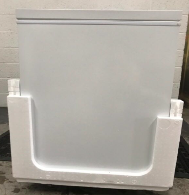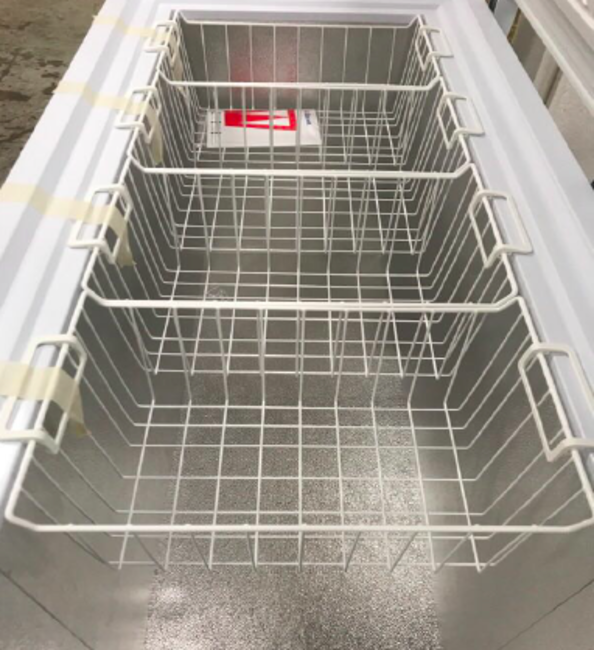 Equipped with lift up stainless lid, handle and lock, defrost water drain complete with 4 wire baskets. Rear: Scratched, dented.Left hand side: in good condition.Right hand side: in good condition.Front & top: Requires cleaning, in good condition.Interior & data plate: four trays, user’s manual, in good condition.Working condition: in good working condition.