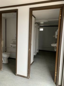 Anti Vandal Steel Portable Toilet Block / Drying Room Office. Wind and water tight. 32ft x 10ft on Jack legs. Fitted with lights, heaters, sinks, hot water boilers, toilets, urinals. Delivery can be arranged.