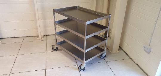 Size in millimetres:914 mm long x 610 mm deep x 1050 mm high 4 x stainless steel adjustable shelves Stainless steel round easy clean legs 4 x 5" neoprene castors 2 braked - 2 non braked