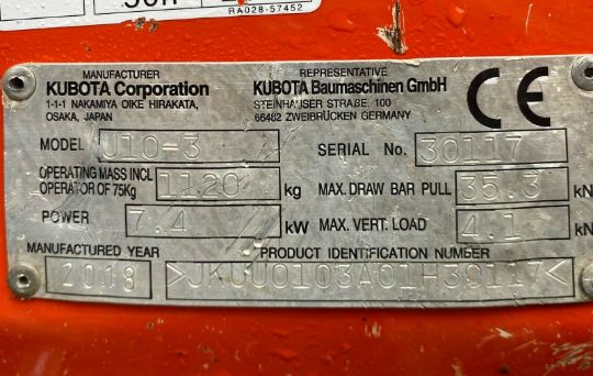 Kubota U10-3 Excavator / Digger 2018. 3 Buckets. Expanding Under-Carriage. Piped. CE Marked