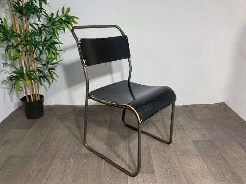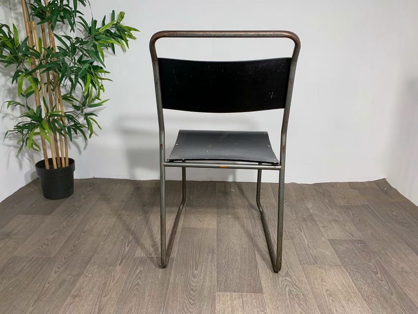 These mid century stacking chairs feature Black seats and backrests with silver / grey frames.