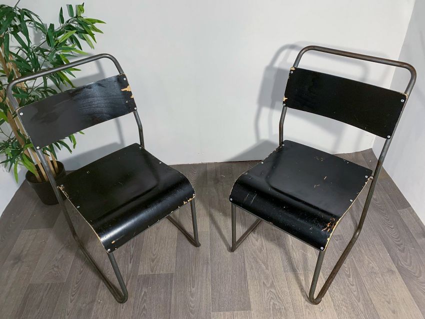 These mid century stacking chairs feature Black seats and backrests with silver / grey frames.