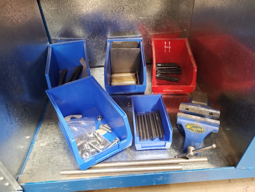Contents of Cupboard including a variety of small metal pieces, nuts, a vice and small steel vice