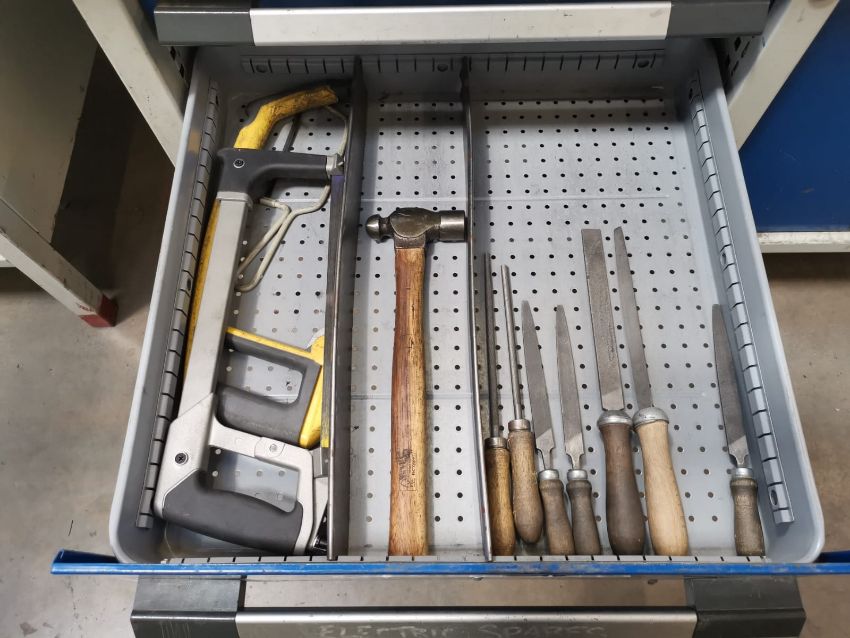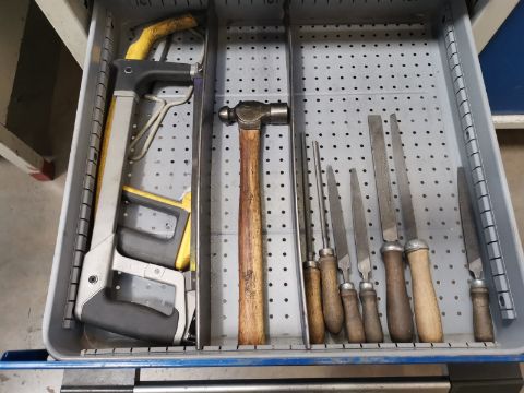 Contents of Drawer compromising of Hand Saws, Wooden Handles Files and Hammer