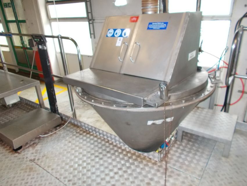 Sack tip infeed hopper with top mounted gate valve set on steel fabricated frame with DMN rotary discharge valve with Greenwood Magnetics inline magnet with Tawi jib arm mounted vacuum 40kg capacity on steel fabricated framework with steel plate floor panels (4m x 6m approx.)