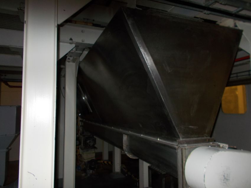 Process hopper (350cm x 80cm x 20cm dia approx.) with explosion relief valve fitted with bottom feed screw conveyor with rotary discharge valve fitted