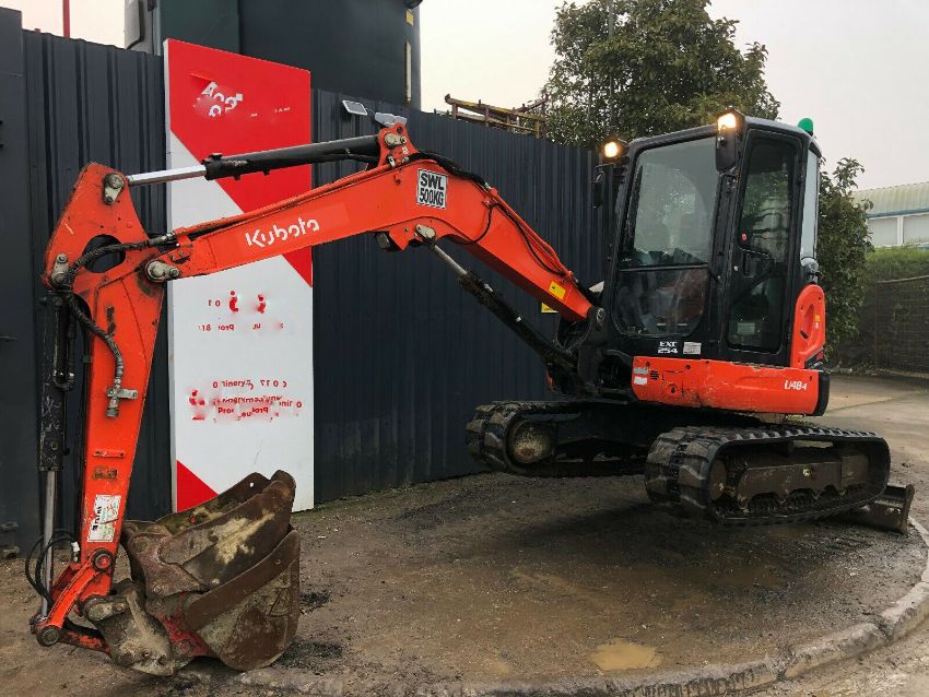 Kubota U48-4 Mini Excavator 2014. Full cab, immobiliser, red key, zero-tail swing. 4 cyl Kubota diesel engine 29.8 kW. Twin speed tracks, piped, blade, hydraulic hitch, 2 buckets, dimensions (LxHxW)mm: 5530 x 2550 x 1960. Max dig depth 3380 mm. Weight 4775 kg