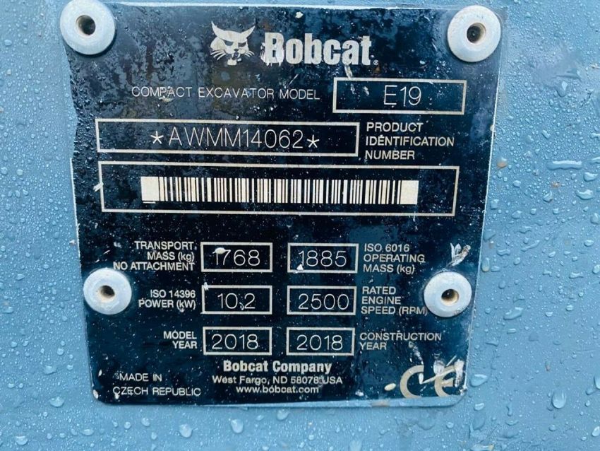 Bobcat E19 Excavator 2018 3 Buckets, Expanding Tracks, 2 Speed Tracking. Work Lights, Piped CE Marked