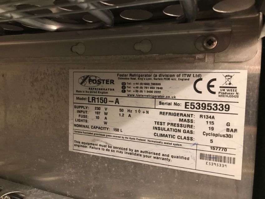 Foster stainless steel freezer approximately 600 mm x 600 mm and model number LR150 – a serial number E5395339