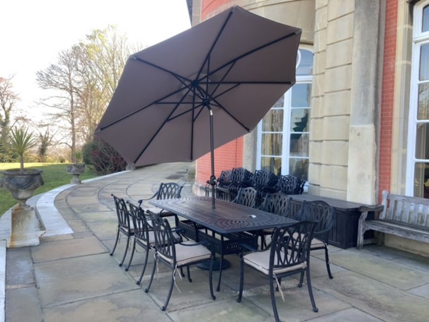 Hartman Cast aluminium patio set comprising table 8 chairs parasol parasol base seat pads 2200 x 1100mm please note parasol has suffered some pitting due to ash damage