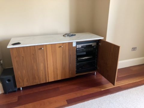 Audiovisual integrated entertainment system comprising Sony Bravia 46inch LCD television Tandberg TTC 8-0 1 HD camera Sony DVD -1930 super audio CD player Netlinx integrated controller model NI -2100 Sony STR -DG 700 multichannel AV receiver with Mission MS6 stereo speaker and 2 x Sony wall speakers with light wood two door display cabinet with pull out centre section and marble top 1700mm