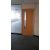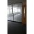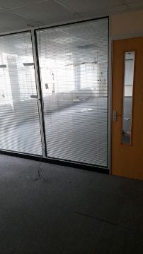 Partition wall with door and internal blinds. Door locked and the key is missing. Height 230cm, width including door 523cm. Width of 3 glass panels 372cm. Sizes are approximate.