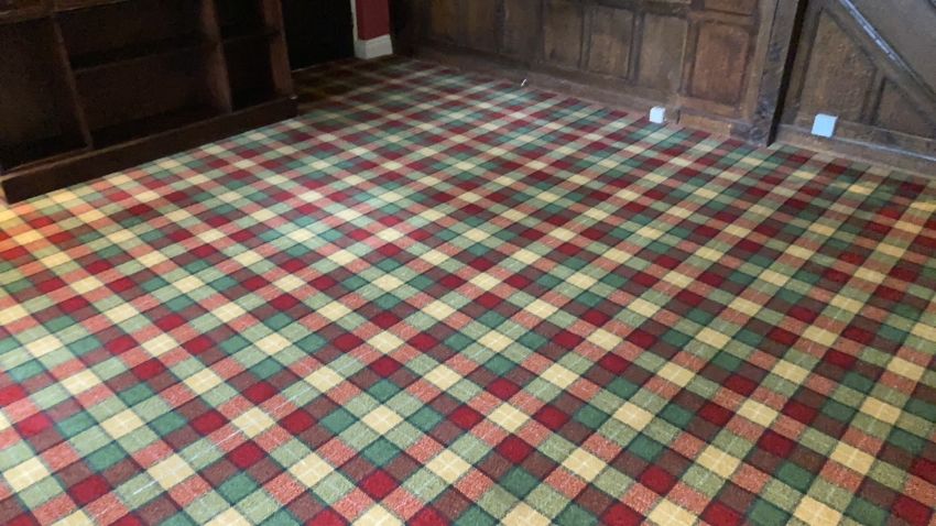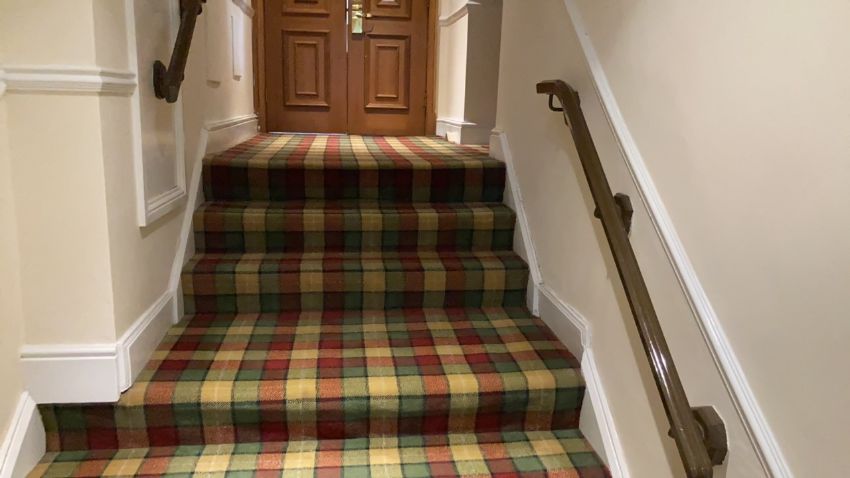Plaid patterned carpet to downstairs reception and lobby areas to include carpets to central stairway and landing areas 50 sq m approx plus stair runs . Please note some signs of wear and tear in some areas