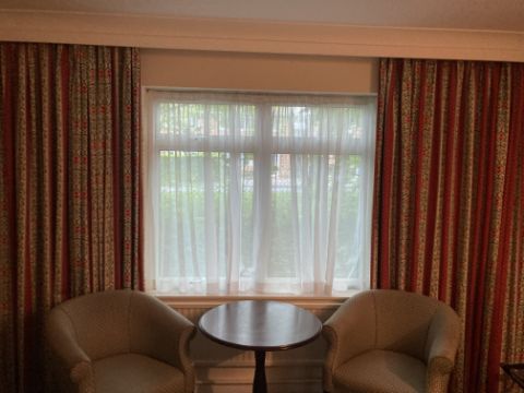 The contents of the bedroom to include double divan bed with wooden headboard 2 x bedside cabinets sofa bed writing desk with upholstered chair tub style armchair circular coffee table suitcase stand wall mirror fitted wardrobe ironing board iron hairdryer and pedestal fan wall lights and contents of the bathroom to include bath with shower over toilet wash basin wall mirror. Full length fully lined curtains a pair of over bed wall lights single wall light hospitality tray. To include bedroom door with card key lock fitted. Does not include television and telephone. Photographs are for illustration purposes and are indicative only. Actual room contents may vary from the photographs shown here. Many bedrooms are located upstairs some on floor 1 and some on floor 2. Please bear in mind that you will need to take items down flights of stairs and there is only one passenger lift.