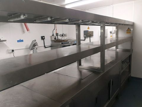 Stotts of Oldham bespoke stainless steel preparation island comprising 2 x double sided heating cabinets a single storage unit with shelving overhead shelving unit and heated gantries 4400mm in total (3 sections)