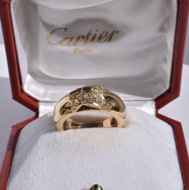 A Cartier 'Panthère' collection diamond and sapphire ring set in 18k yellow gold. The ring features a thick gold band with a pave-set panthere design set with round brilliant-cut diamonds and a sapphire set eye.