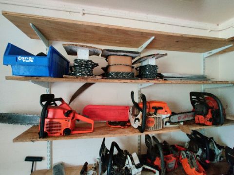 Selection of chain saws, for spares or repair, parts included too. Located in in002 engineering
