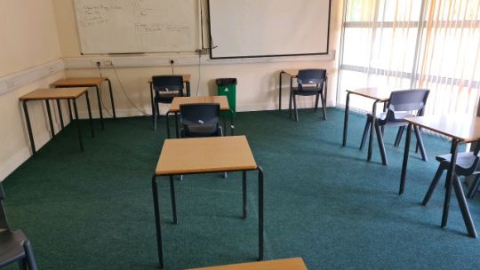 A quantity of classroom furniture to include 12 exam tables. 10 plastic chairs 1 projector screen Grizedale