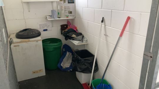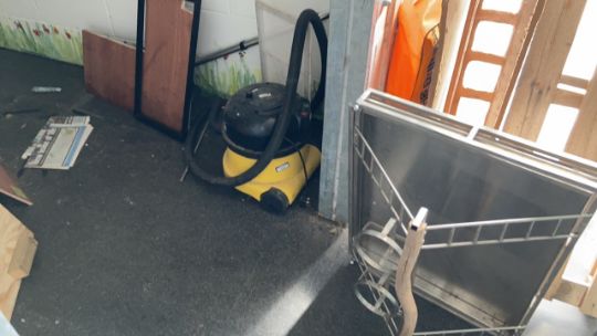 The contents of the store room to include bay of lightweight storage racking, mops, buckets and other cleaning items, 2 x parrot cages, Numatic vacuum cleaner, corrugated plastic roof panels, hose reel and others As lotted Loc.RY015