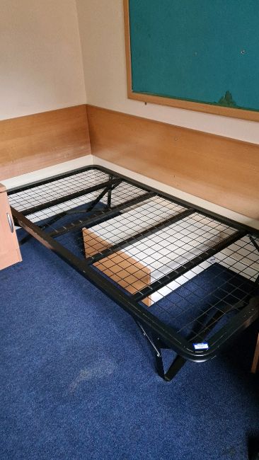 Student Accommodation. Comprising Coolzone fridge freezer. Stirflow 700w Microwave. 8 x blue plastic chairs. Table. 8 x Metal bed frames. 8 x Side Cabinets. 8 x Chest of drawers. 8 x Swivel Chairs, As lotted, Loc. Fairfield 1.