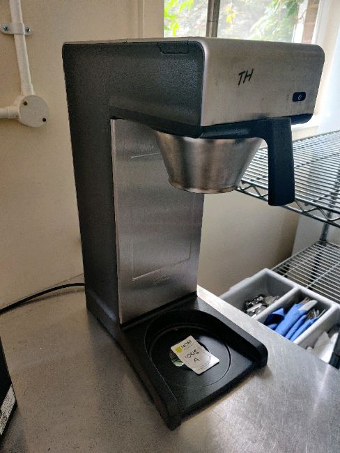 The Bravilor TH is manual water fill quick filter machine for direct coffee brewing into airports. Serial number 1898582. Located in fe004 back kitchen.