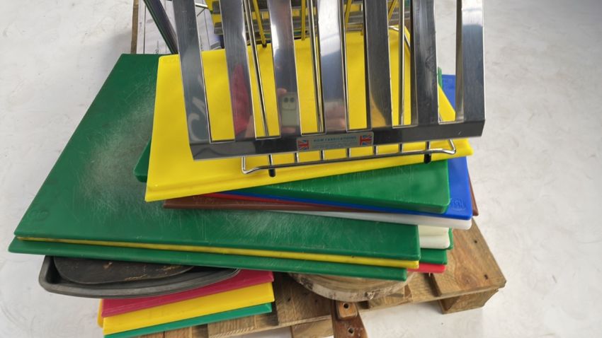 To include chopping boards, various sized chopping board, holders, wood boards, trays, selection of crockery and 2 clingfilm professional wrap packages