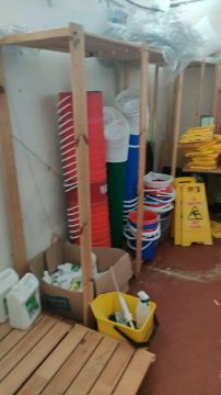 Contents of cleaning room to include buckets signs brushes chemicals as lotted, located in maintenance store