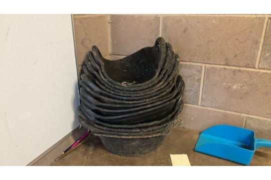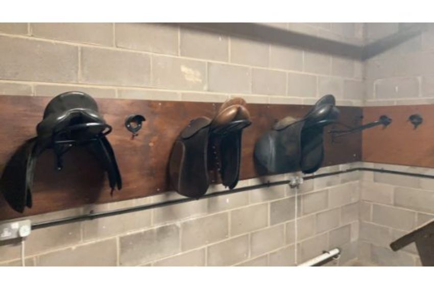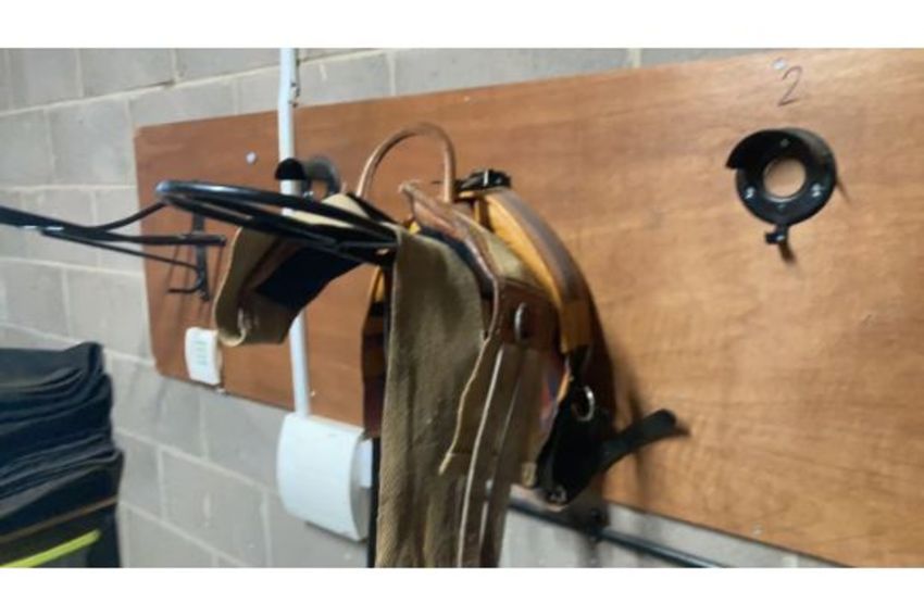 The contents of the tackroom and feed store to include bespoke timber frame saddle cleaning stand 12 x saddle racks 3 x saddles a miscellaneous quantity of tack comprising harness, side reins, neck straps, bridles, lead reins, head collars, girth straps, galvanised feed bin, plastic feed buckets As lotted