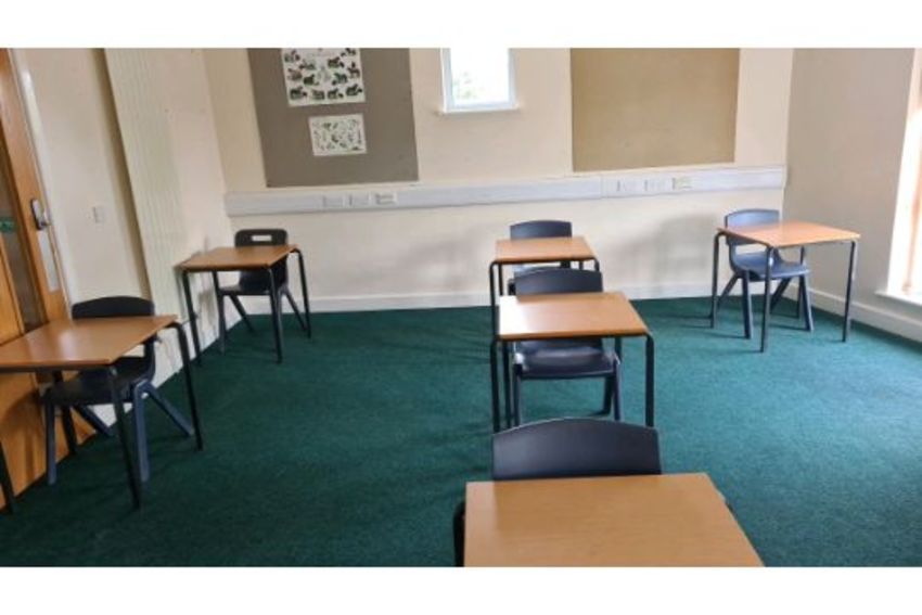 A quantity of classroom furniture to include 23 exam desks and 22 plastic chairs Grizedale
