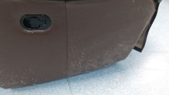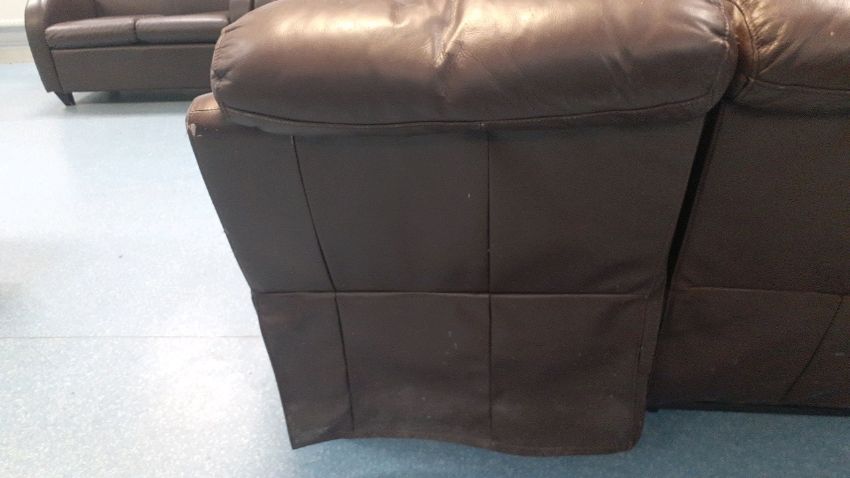 A two seater leather twin recliner (not working) sofa Clear signs of wear and tear as lotted Sports hall