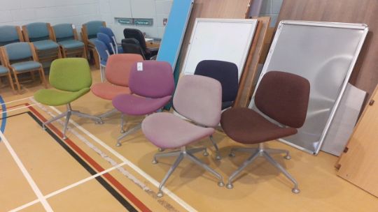 A set of steel frame swivel chairs in various colours x 7 As lotted Some signs of wear and tear Sports hall