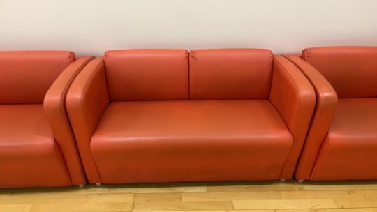 Assortment of red furniture Including 4 chairs 2 bar stools 4 small sofas 1 large sofa All to be removed by the buyer,