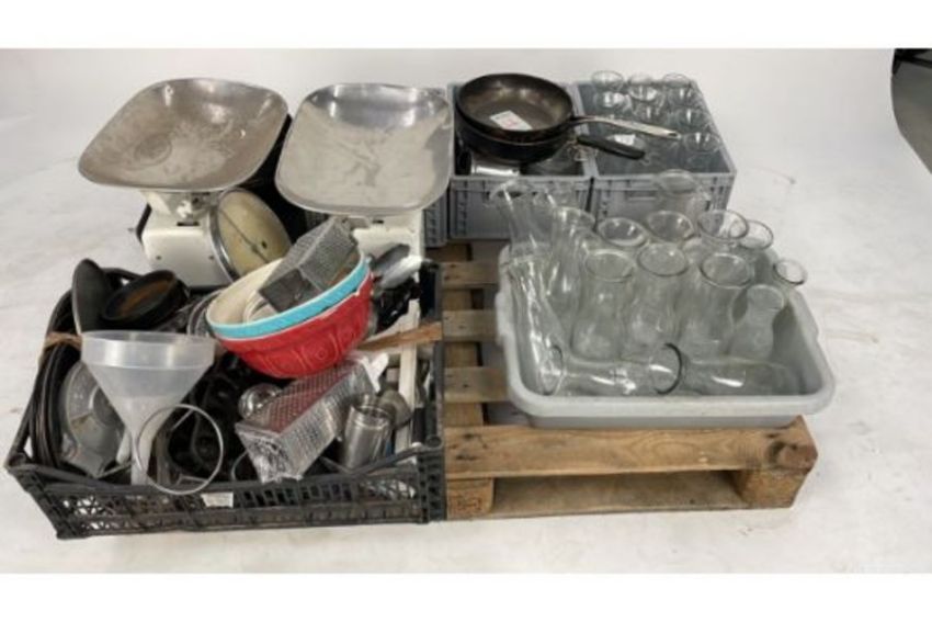 Contains a mixture of scales trays baking tin accessories wine water jugs little side glass jugs pans and various utensils example graters potato mashers spoons