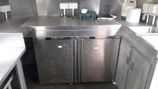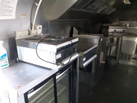 Preparation and service counters throughout Lincat BS4W four bath Bain Marie 2 x Lincat chip fryers Parry fryer Lincat DF66 twin basket fryer Blizzard Blue Line Chill saladette counter heated gantry lighting 2 x Blizzard freezers twin bowl sink unit fume extraction canopy Note vehicle has not been in use for some time and equipment has not been testedYOM 1971GVWR 5800kgGAWR front 2600kgGAWR rear 2600kgNo keysSold as seen