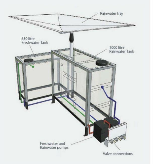 Rainwater is stored in the large tank and used to service the toilets. In the case of no rain a simple float switch will divert fresh water into the rainwater tank, so a constant source is maintained.