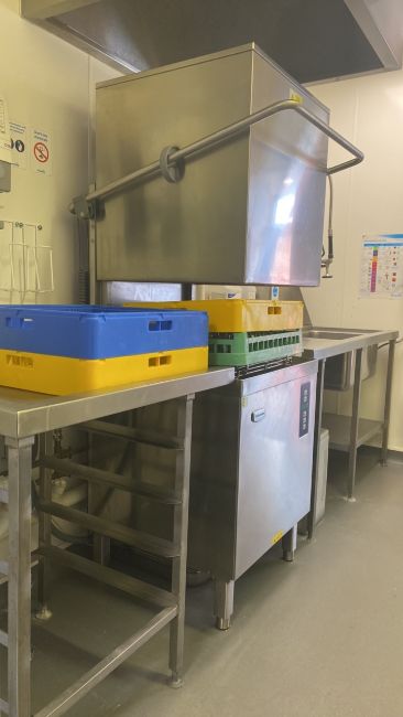 Includes: stainless steel sink unit with nozzle, grease guzzler, suma star-plus D1 plus, stainless steel shelving/tray unit, coloured wash trays