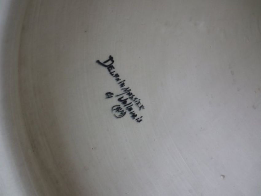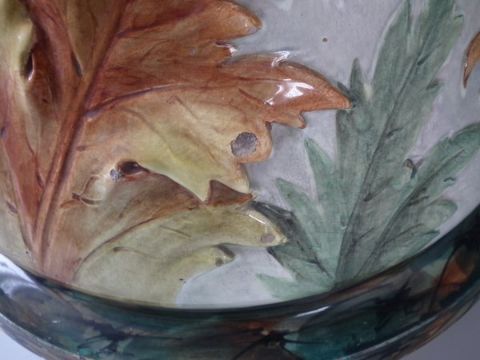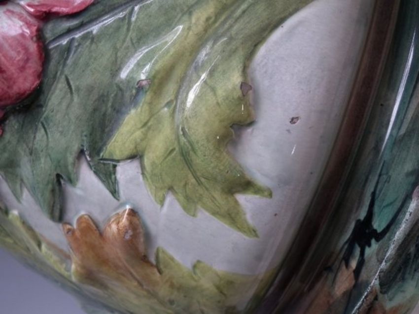 CONDITION REPORT:Jardiniere: Generally good. Chips and flakes to rim and one to interior. Scratches from use.