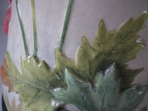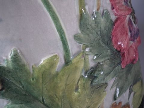 Delphin Massier Majolica jardinière and stand which features poppies. Colouration: cream, pink, green, are predominant. The piece bears maker's marks for the Delphin Massier pottery. (The jardiniere and stand have been matched together at some point. Although aesthetically pleasing together, originally, the stand for this jardiniere would have had the same type of ground (ie: irregular geometric blocks). And a slightly bulkier size.)