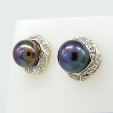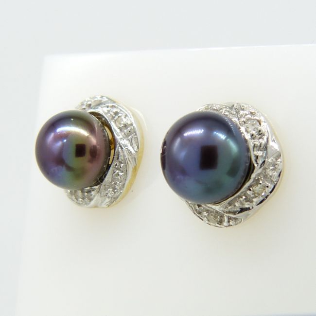 Pearls: cultured; purple / teal tones with iridescenece; 6mm diameter each. Diamonds: natural; 10 x round-cut; 0.05 cts total approx. With butterfly backs and gift box.